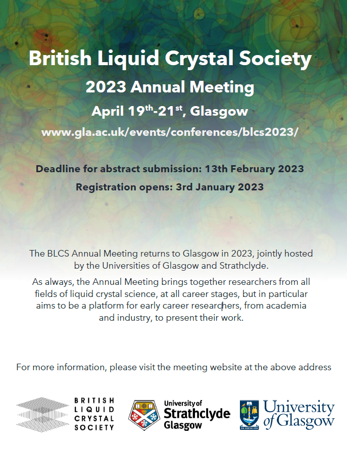 Registration for the 2023 British Liquid Crystal Annual Meeting is now open. The meeting will take place in Glasgow, jointly hosted by the Universities of Glasgow and Strathclyde, between 19-21 April 2023.